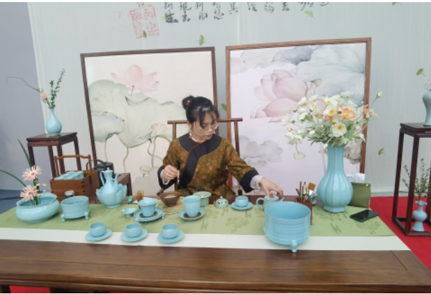 4月20日,在河南省汝州市汝瓷小鎮(zhèn),河南弘寶汝瓷坊有限公司展位,汝瓷技藝傳承人馬凱歌身著茶服,背靠紗畫,焚燃香薰,專心致志地進(jìn)行點(diǎn)茶表演,一旁的助手正在線上直播,吸引不少粉絲“圍觀”。