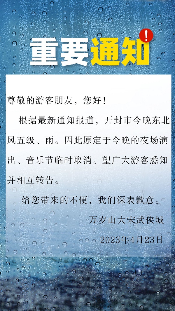 重要通知!萬歲山大宋武俠城4月23日夜場演出取消!