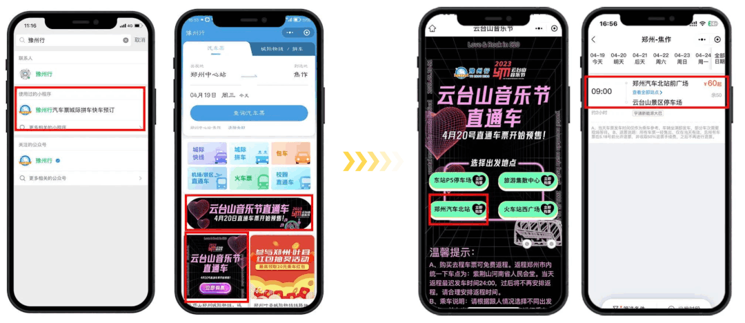 1、如圖所示:微信搜索“豫州行”小程序,選擇云臺山音樂節(jié)直通車。