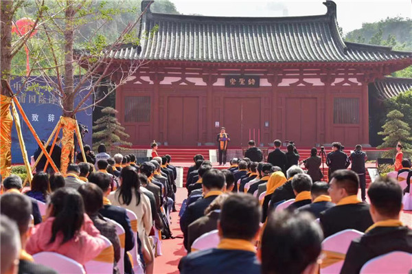 在隆隆的盛世禮炮中,禮拜詩(shī)圣大典典禮正式開(kāi)始。伴著悠揚(yáng)的古樂(lè)聲,開(kāi)門(mén)迎圣、敬獻(xiàn)花籃、禮拜詩(shī)圣、恭讀拜文等儀式逐一進(jìn)行。每一項(xiàng)儀式,都表達(dá)著對(duì)詩(shī)圣杜甫的深深敬意。