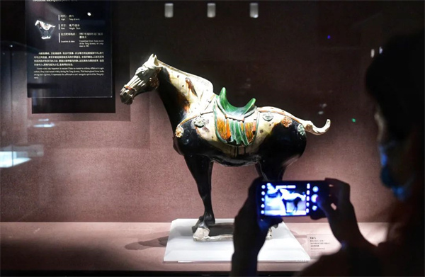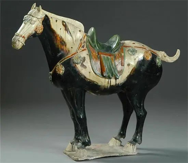 這尊唐三彩黑釉馬全身黑色,唯馬面、鬃尾和四蹄為白色,鞍韉為綠、黃、白三色相間,在唐三彩中實(shí)屬罕見,是文獻(xiàn)中“龍種神駒,四蹄踏雪”的藝術(shù)再現(xiàn)。