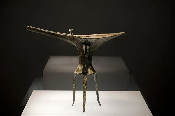 它長(zhǎng)流尖尾,圓腹束腰,三足細(xì)長(zhǎng)外撇,仿若一個(gè)楊柳細(xì)腰的女子翩翩起舞。平腹一側(cè)有半環(huán)形鋬,流近口處有菌狀短柱兩個(gè),腹部一面有兩道寬1.2厘米的凸線,兩線間橫刻裝飾五個(gè)乳釘,彰顯著無(wú)聲的王者之尊,堪稱稀世珍寶。
