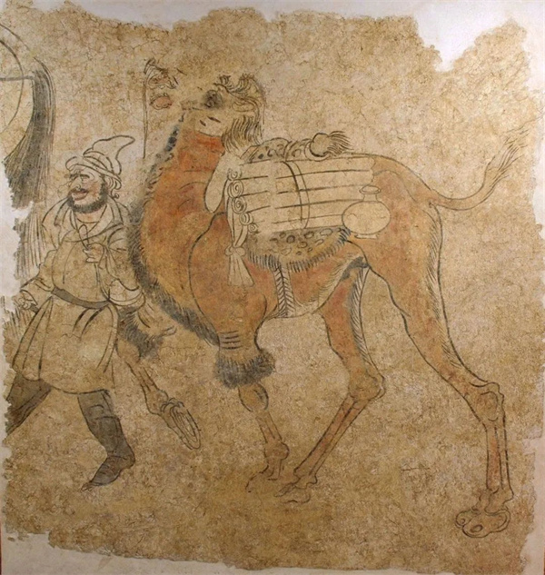 高大雄健的駱駝昂首挺胸、闊步前進(jìn);牽駝的胡人高鼻梁、深眼窩、絡(luò)腮胡、唇紅齒白,頭戴高尖番帽,身穿翻領(lǐng)衣袍,小袖細(xì)衫,腳蹬尖勾鞋頭。與真人真物身高相差無(wú)幾的人物和馬匹,展示了大唐盛世的精神風(fēng)貌與時(shí)代氣息,代表了唐代壁畫的較高成就,是研究唐代繪畫藝術(shù)和社會(huì)制度及“絲綢之路”文化的珍貴資料。