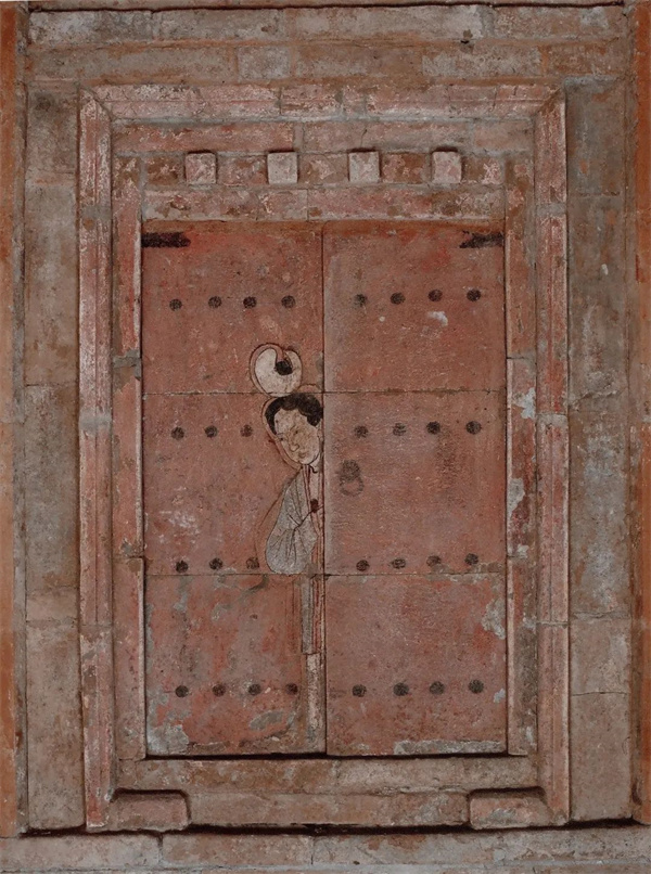 門扉半掩中一個(gè)頭戴白色團(tuán)冠,身著淡青色上衣、白色裙子的貌美女子從兩扇門中露出半個(gè)身子,神態(tài)嬌羞,似在觀望,又好像在發(fā)呆,讓人對(duì)她身后的世界也充滿遐想,將狹小的墓室空間在思緒中擴(kuò)大。