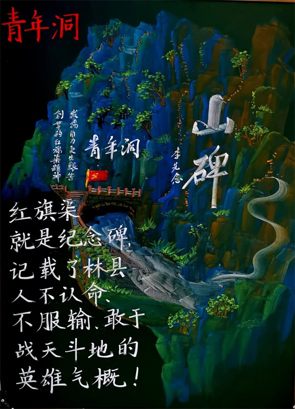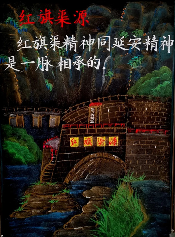 一支粉筆繪就偉大精神,一片丹心哺育萬千桃李。河順一中的郭玲玲老師通過用不同顏色的粉筆,流暢的線條,使紅旗渠躍然黑板之上。一幅幅畫作, 構(gòu)思縝密,活靈活現(xiàn)、沉穩(wěn)中透著靈動,磅礴處恣意揮毫。