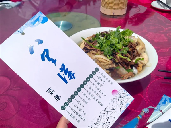 在新鄉(xiāng)八里溝景區(qū)山門(mén)廣場(chǎng),數(shù)十桌農(nóng)村大席次第排開(kāi),讓來(lái)自全國(guó)各地游客,共同品嘗鄉(xiāng)間美味。小酥肉、蒸皮渣、 大燴菜、 土雞蛋炒構(gòu)棒、黃精燉草雞等富有當(dāng)?shù)靥厣牡氖笸,吃過(guò)以后游客們贊不絕口,直呼過(guò)癮。