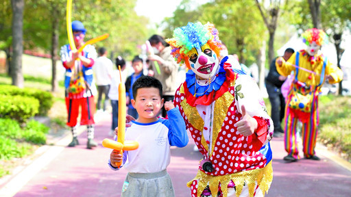 小丑與游客互動(dòng) 鶴壁日?qǐng)?bào)社直播鶴壁工作室供圖