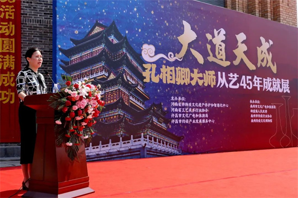 首先,許昌市文化廣電和旅游局黨組書記、局長李紹英向來自全國各地前來參加慶典活動的嘉賓朋友表示熱烈的歡迎和誠摯的感謝!同時也?紫嗲浯髱熒湛鞓!孔相卿大師生在神垕、長在神垕,是神垕的大地撫育了孔相卿,是神垕的資源成就了孔相卿,鈞瓷燒制技藝國家級非遺代表性傳承人孔相卿將科學應用于鈞瓷創(chuàng)作過程中,他創(chuàng)造的“一器多法、以器定法”的現(xiàn)代工藝,實現(xiàn)了生產(chǎn)工藝的重大突破,他發(fā)明的“銅系青藍釉”及“銅系金彩紅”更是科技與藝術結合的典范,這些作品代表了當代鈞窯的巔峰之作。