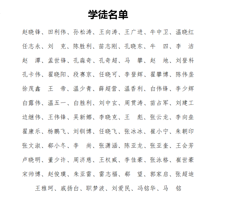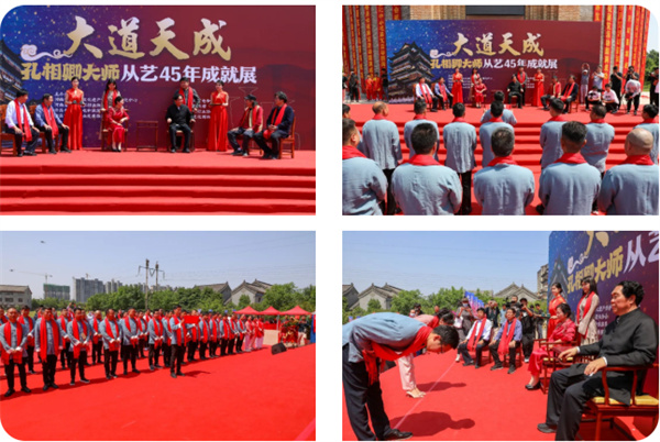 在中國工藝美術大師吳元全、仵應文、王冠軍、郭愛和的見證下,83名學徒按照傳統(tǒng)禮儀,正式拜鈞瓷燒制技藝項目國家級級非遺代表性傳承人、中國工藝美術大師孔相卿為師,依次向師父、師母行拜師禮、遞拜師貼、奉茶等環(huán)節(jié)?紫嗲浜推拮訌埾烧湎驅W生代表發(fā)放收徒貼,鼓勵所有學徒勤奮學習、愛鈞重道,團結一致,為鈞瓷燒制技藝項目的發(fā)揚光大做出貢獻。