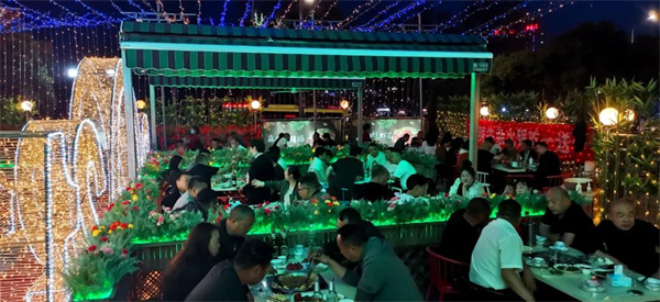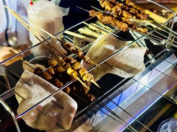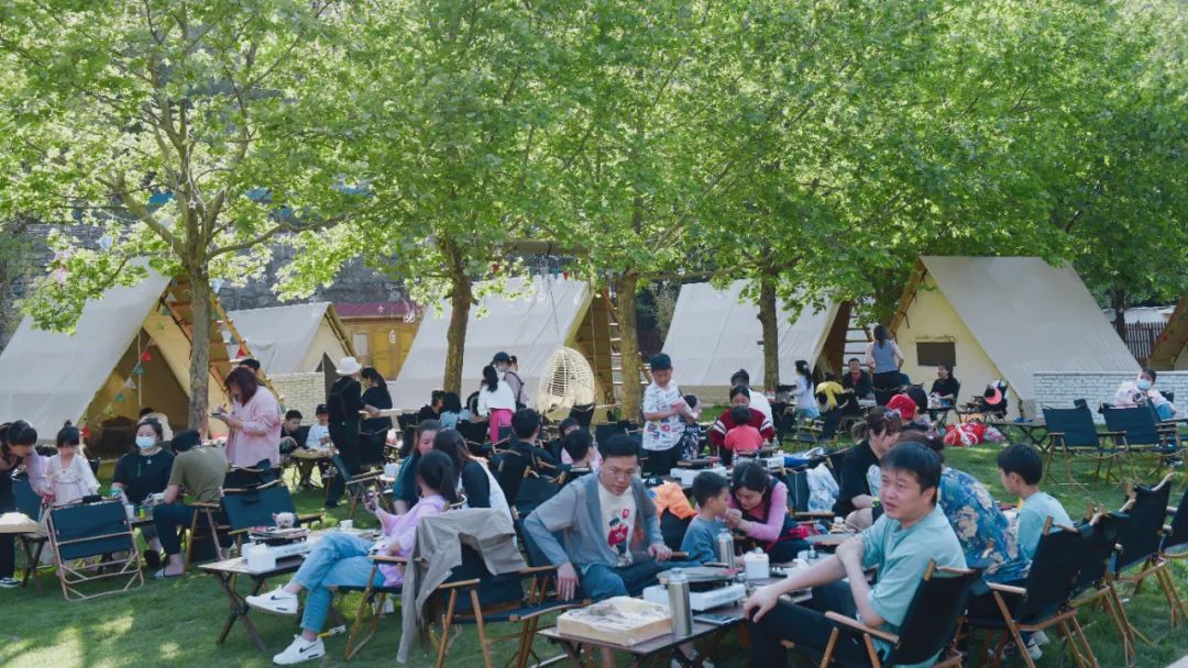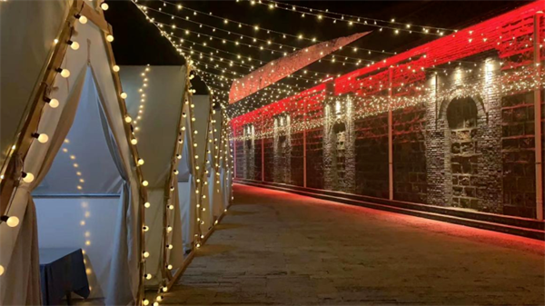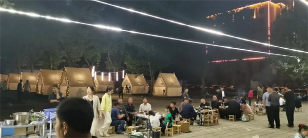 在河南省鞏義市常香玉故里,來一場與星空美食為伴的燒烤露營!登上景區(qū)的觀景平臺,布置獨(dú)特的露天營地,立刻吸引了人們的目光。一頂頂由燈串裝飾的帳篷,在綠色草坪的映襯下趣意盎然?諝庵袕浡鴵浔堑南銡,燒烤攤前滋滋的煎烤聲,時刻挑逗著游客的味蕾。冷飲、啤酒、燒烤……窯洞式店鋪裝修,既懷舊又體現(xiàn)了鞏義的地方特色。三五好友相約,在一片蔚藍(lán)的星空下,有燒烤佳肴相伴,小酌一杯,暢談一番,一起享受別樣的快樂。