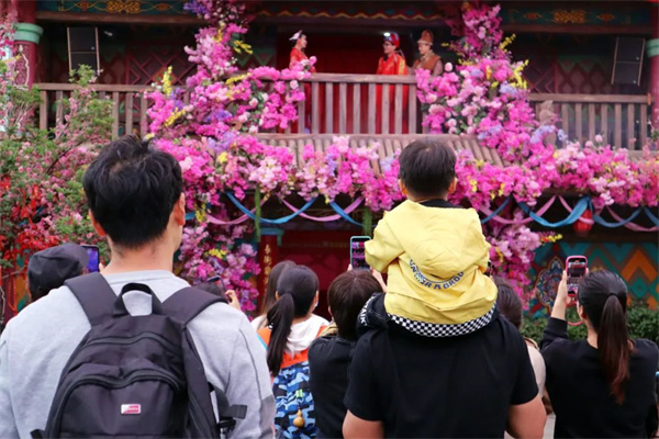 在景區(qū)工作人員的帶領下,參觀隊伍先后走進風花街觀看行進式互動秀《雪月國風》,并積極參與互動。隨后漫步煙云街、彩樓廣場等地,觀看《精靈部落》《靈狐尋情》等精彩演藝秀。