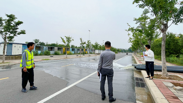 隨著降雨再度增強,同心湖達到湖面設(shè)計警戒水位,華盛軒有湖水倒灌風(fēng)險。防汛隊員立即行動,運輸堆放大量沙袋到指定地點,對出入口水流進行封堵、引導(dǎo),借助龍吸水和大流量排污車進行強排作業(yè),經(jīng)各小組緊密協(xié)作,同心湖水位持續(xù)下降到安全水位以下,演練圓滿結(jié)束。