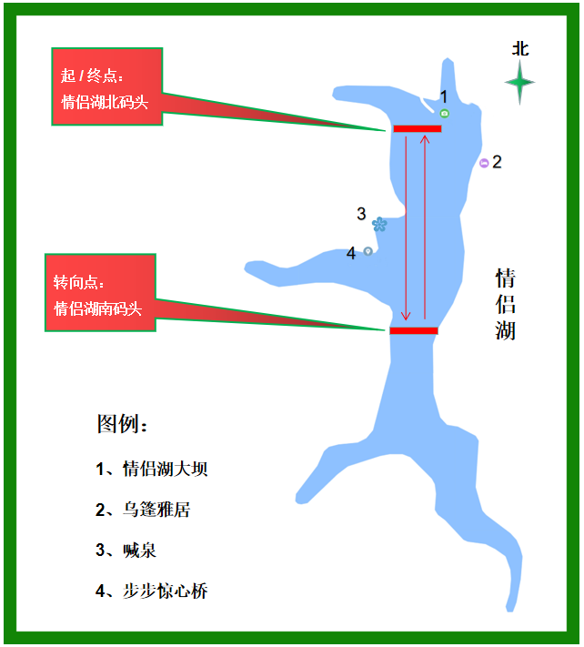 本次大賽為往返賽,起點為情侶湖北碼頭,到達南碼頭后返回至北碼頭,單程為400米,往返全程為800米。