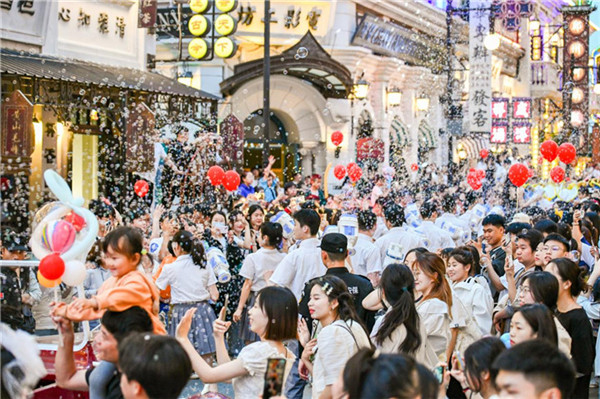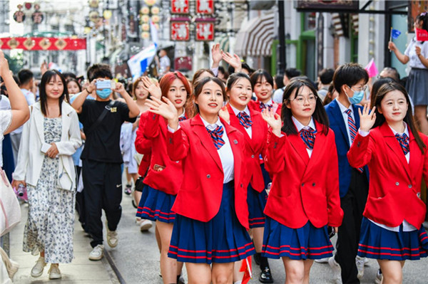 走進(jìn)電影小鎮(zhèn)內(nèi),也處處充滿著驚喜。人流涌動(dòng),園內(nèi)隨處可見穿著校服的大學(xué)生,參加完入園歡迎儀式的眾人拿著畢業(yè)彩旗,涌向世界大劇院廣場,樂隊(duì)、大合唱、畢業(yè)宣言,層出不窮的活動(dòng)讓“畢業(yè)旅行”儀式感拉滿。宣言后,數(shù)以萬計(jì)的紅色氣球在廣場中央放飛,現(xiàn)場歡呼陣陣,大家共同拿起手機(jī)記錄下這一難忘時(shí)刻。
