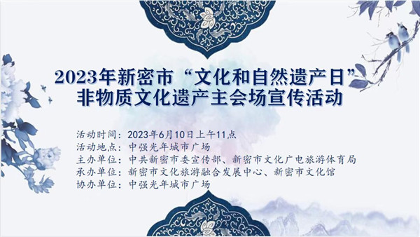 新密市2023年“文化和自然遺產(chǎn)日”非遺宣傳展示系列活動(dòng)將于6月10日在中強(qiáng)光年城市廣場(chǎng)正式啟動(dòng),今年活動(dòng)的主題為:“加強(qiáng)非遺系統(tǒng)性保護(hù) 促進(jìn)可持續(xù)發(fā)展”,口號(hào)是“加強(qiáng)非遺保護(hù)傳承 守護(hù)共有精神家園”“講好中國(guó)非遺故事 深化文明交流互鑒”。