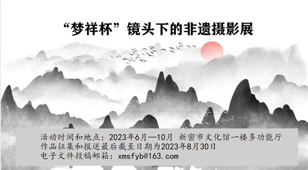 為展示該市非遺項(xiàng)目風(fēng)采,記錄非遺在促進(jìn)中華文明可持續(xù)發(fā)展進(jìn)程中的積極作用,進(jìn)一步繼承和弘揚(yáng)中華優(yōu)秀傳統(tǒng)文化,更加有效地利用影像資料開(kāi)展非遺的記錄、保護(hù)工作,舉辦“夢(mèng)祥杯”鏡頭下的非遺2023新密非物質(zhì)文化遺產(chǎn)攝影展活動(dòng)。