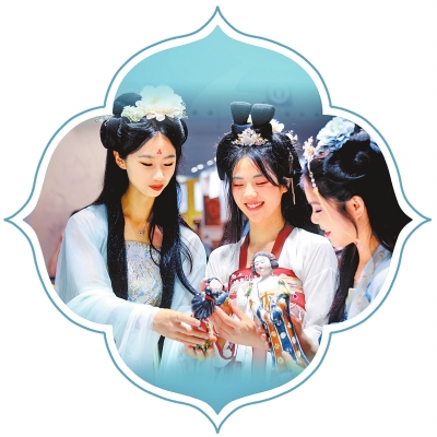 幾位漢服愛好者來到位于14號館的洛陽非物質文化遺產(chǎn)及工藝美術展區(qū)參觀