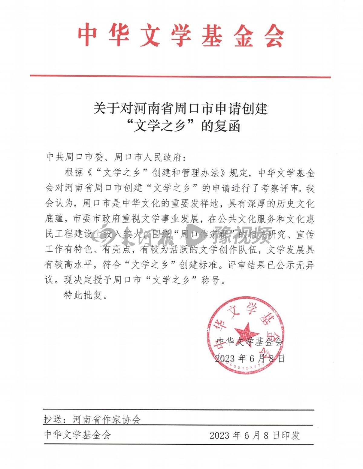 6月8日下午,記者從周口市作家協(xié)會(huì)獲悉,中華文學(xué)基金會(huì)正式復(fù)函,決定授予河南省周口市“文學(xué)之鄉(xiāng)”稱號(hào)。