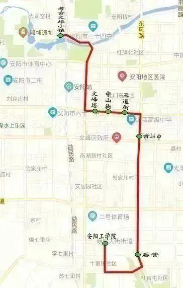途經(jīng)站點:安陽工學(xué)院、后營(安陽師院)、市一中(魁星閣)、三道街(縣前街、倉巷街、新丹尼斯、藍鵲酒店)、中山街(鐘樓、美食一條街)、文峰塔(老丹尼斯、文峰小吃街)、安陽殷墟考古文旅小鎮(zhèn)