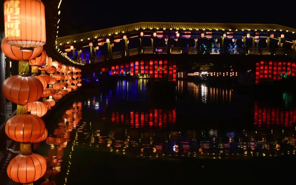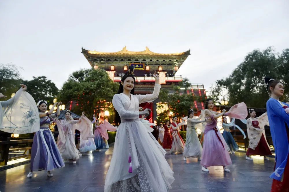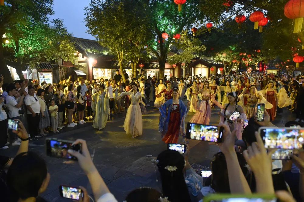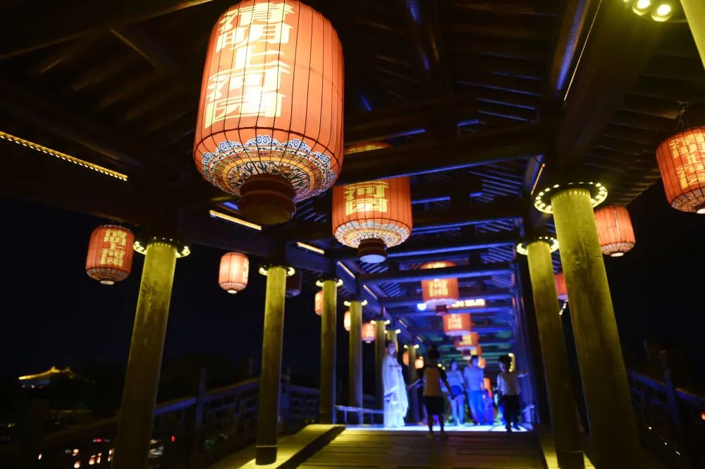 夏日夜晚,河南省開封市清明上河園內燈火輝映,游人往來,展現(xiàn)“大宋不夜城”的熱鬧景象。