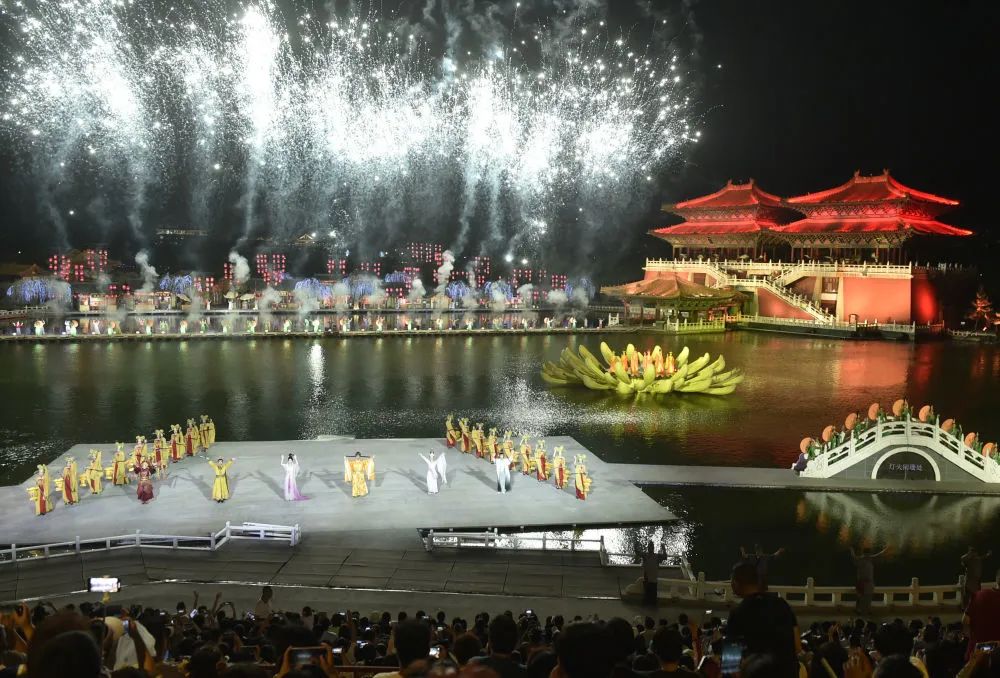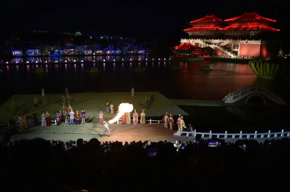 6月7日晚,游人在開封清明上河園內觀賞大型水上實景演出《大宋·東京夢華》。