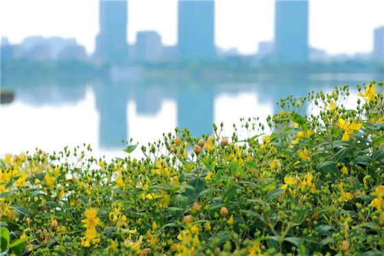 仲夏時分,商丘市日月湖景區(qū)的金絲桃絢爛綻放。修長細密的花蕊燦若金絲,一朵朵金色的花好似飛舞的“金蝴蝶”。