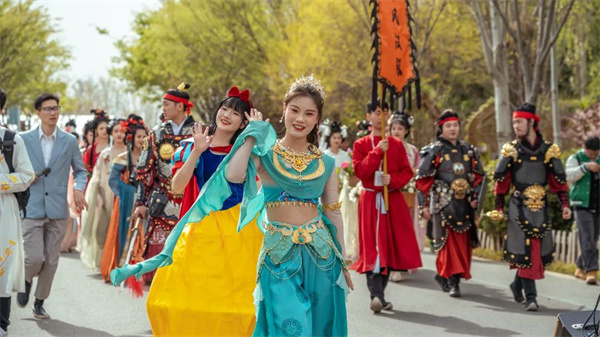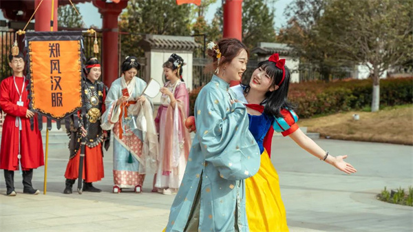 每日上午11點(diǎn)30分,白雪公主攜民族少女、搞怪小丑和卡通玩偶等一眾好友身著靚麗演出服精彩亮相,沿著主園路向游客互動(dòng)問好,分發(fā)香囊、五彩絲帶等禮品,送上節(jié)日的美好祝福。