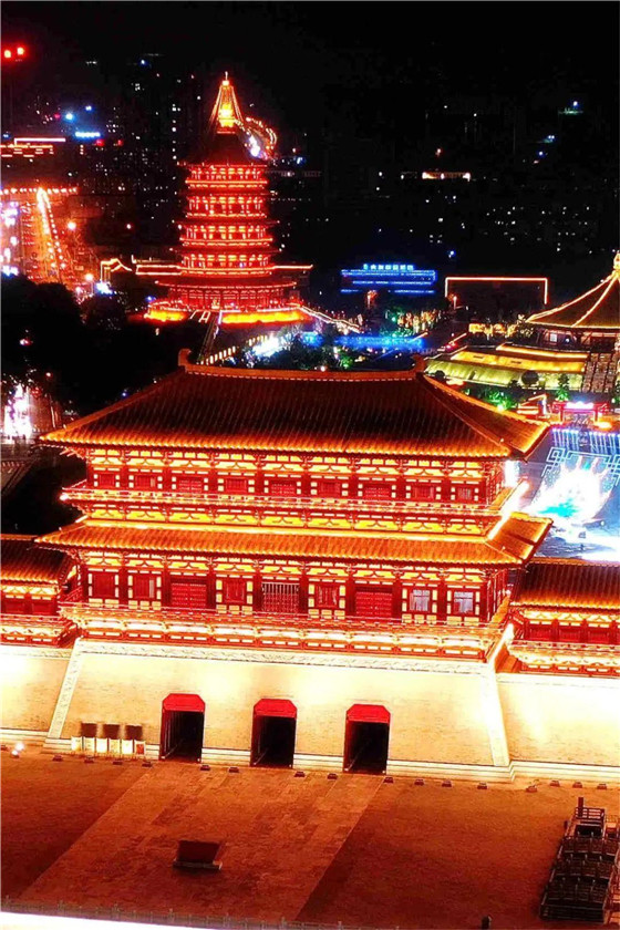 當(dāng)夜幕降臨,華燈初上,應(yīng)天門、明堂天堂、九洲池等建筑被一一點(diǎn)亮,流光溢彩的線條將城墻與建筑勾勒出溫暖的色調(diào),城市的夜之魅力在這里呈現(xiàn)。