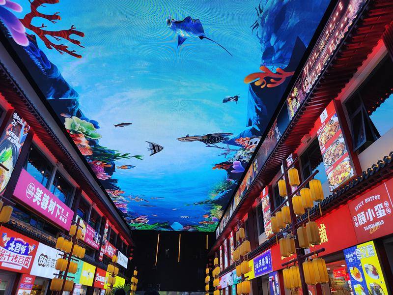 在這里,一幕幕震撼人心的唯美動(dòng)態(tài)畫(huà)面伴隨著聲、光、電的立體科技特效,給人留下難以忘懷的印象。時(shí)尚前衛(wèi)的天幕秀,不僅讓這里的夜晚更加繽紛璀璨,也讓來(lái)到這里的人們喜看天空云卷云舒,欣賞四季景色變化,讓飛鳥(niǎo)游魚(yú)以不同的姿態(tài)呈現(xiàn)人們眼前,讓人在光影變幻間,度過(guò)一段非同尋常的歡樂(lè)時(shí)光。