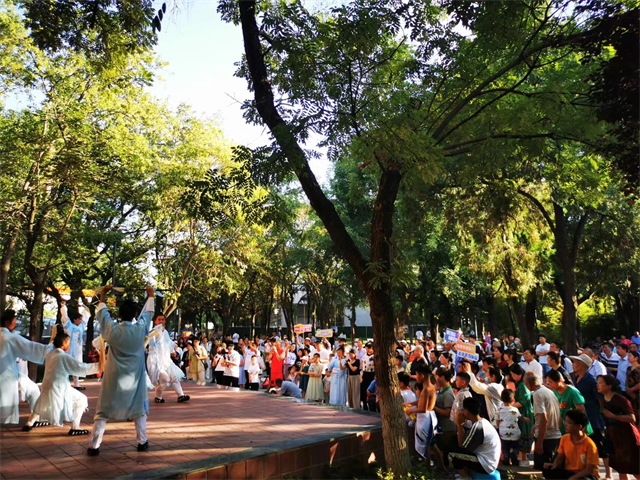 在互動(dòng)環(huán)節(jié),觀眾們?cè)诂F(xiàn)場(chǎng)跟隨武術(shù)隊(duì)員學(xué)習(xí)體驗(yàn)了武當(dāng)養(yǎng)生功,深刻感悟武當(dāng)武術(shù)健康、和諧、向上的精髓和文化內(nèi)涵。