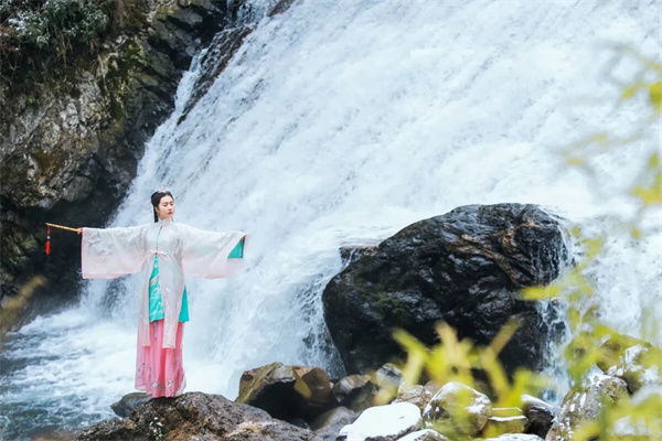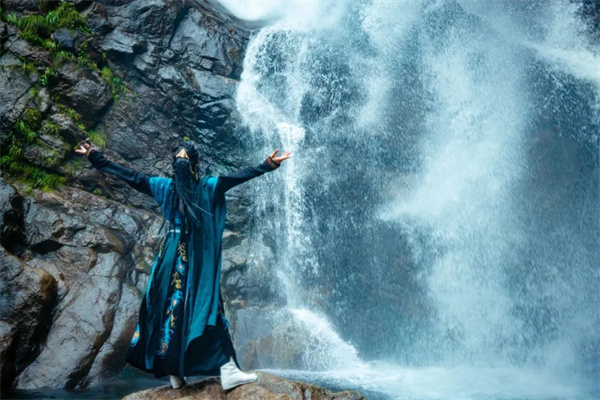 如果想打卡武俠大片,白云山「會龍瀑布」必須要來。會龍瀑布水流貼峭壁直下,人站在瀑布下方的平臺上,相機離人物稍遠一些,放大鏡頭倍數(shù)或者開啟廣角,采用微微仰拍的角度,就會收獲一組江湖武俠既視感大片。
