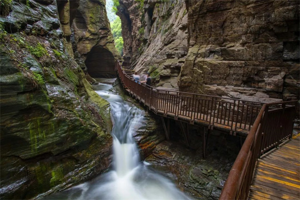 來到重渡溝的滴翠河景區(qū),沿途風格各異的民宿集群、十里翠竹長廊都讓你對瀑布的期待更多了一分。可以先到震天雷瀑布,長滿青苔的崖上,兩條激流如天河直瀉,人未見水影,卻聽見瀑聲隆隆震天作響,如同天上打雷一般。