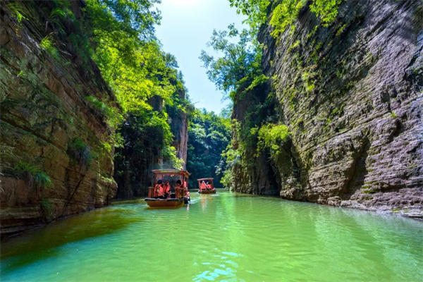 綠意正濃,毫無保留的陽光和藍天、峽谷雙壁對峙,奇石崢嶸,百潭爭鳴,水流潺潺。漫山松林簌簌淺唱,一步一震撼。