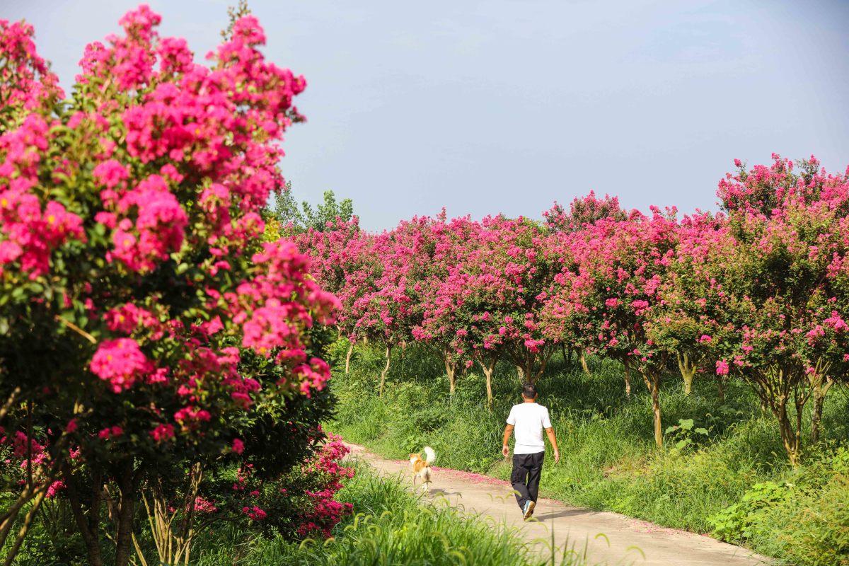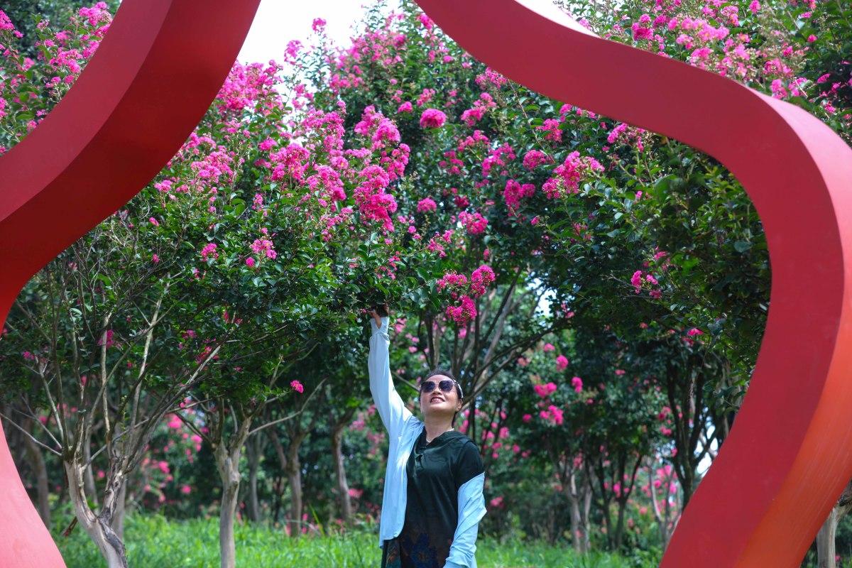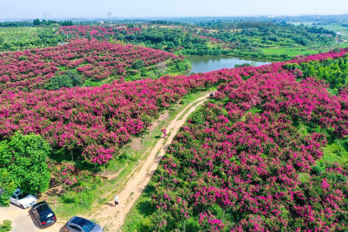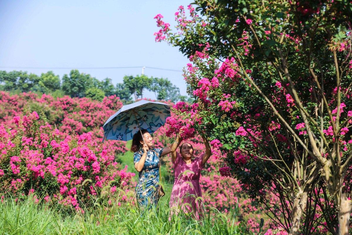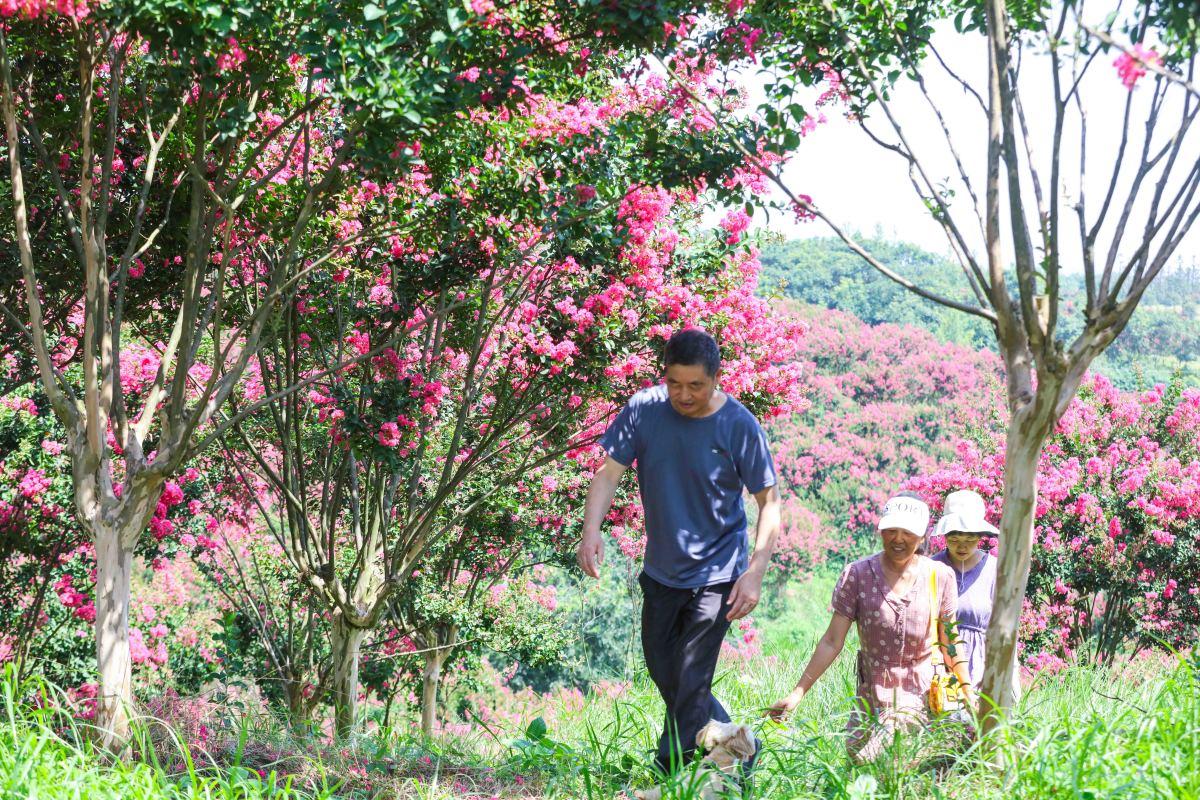 7月16日,游客在信陽市光山縣槐店鄉(xiāng)司馬光油茶園景區(qū)紫薇園花海中游玩。眼下,紫薇園花開成海,如同人間仙境,吸引著大量游客慕名而來觀賞、拍照。近年來,光山縣在實施鄉(xiāng)村振興的過程中,注重依托生態(tài)山林、田園景色等發(fā)展鄉(xiāng)村旅游項目,吸引眾多游客前來觀光旅游,帶動當?shù)剞r(nóng)家樂、農(nóng)副產(chǎn)品銷售等多項經(jīng)營收入增長。