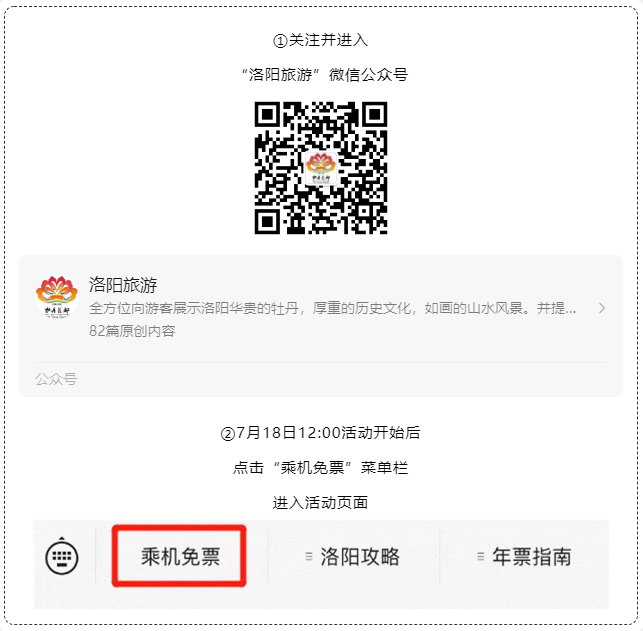 微信搜索“洛陽旅游”、“享游洛陽官方”,進入洛陽旅游或享游洛陽微信公眾號,點擊左下方菜單欄“乘機免票”,進入專題活動頁面預(yù)約門票,預(yù)約時請仔細關(guān)注提示信息。(2023年7月18日12:00開啟預(yù)約通道)