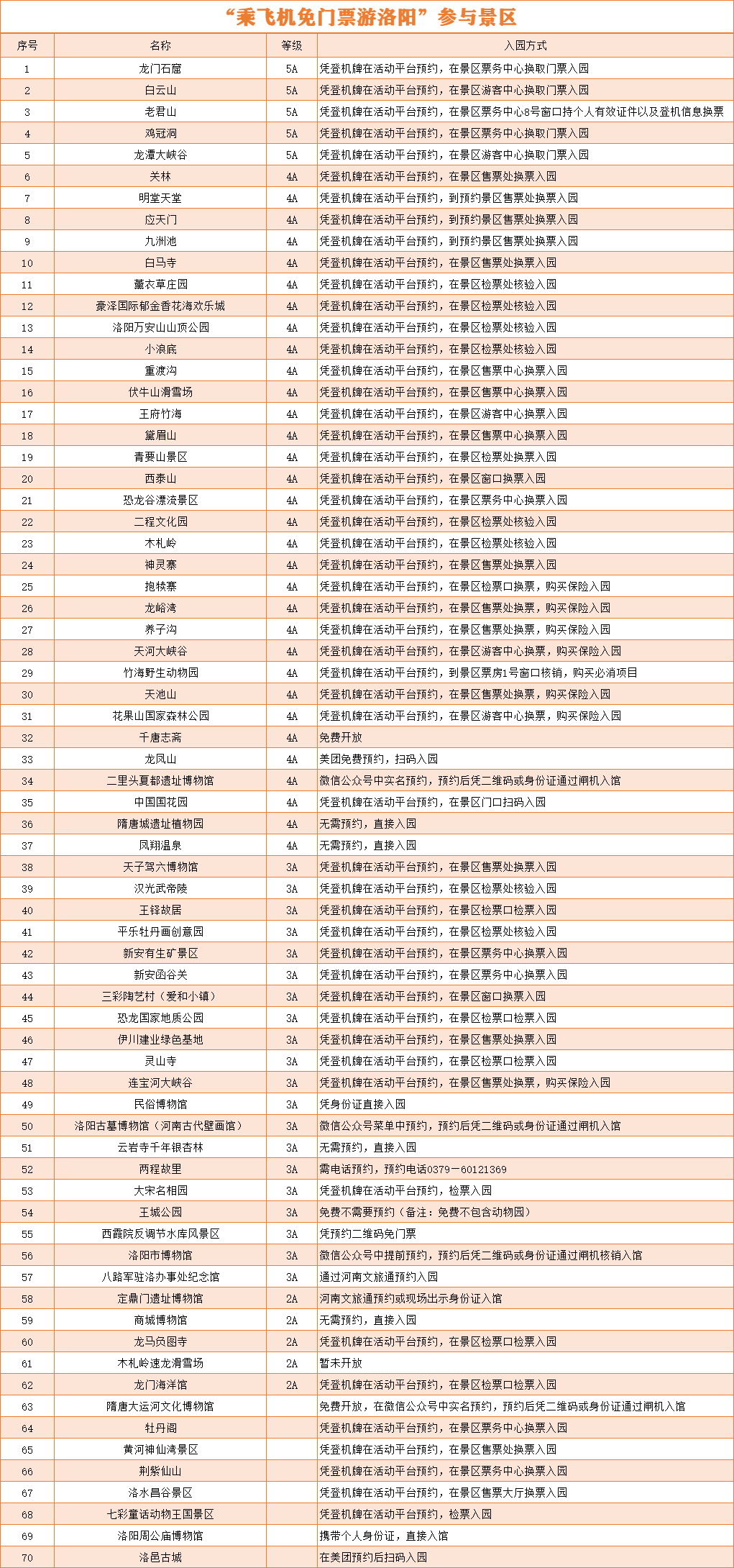2023年7月18日起至2023年12月31日,洛陽市推出“乘飛機免門票游洛陽”活動,乘坐抵達洛陽機場航班的乘客,在抵達洛陽后10天內(nèi)(含當天),憑登機牌(紙質(zhì)/電子)通過預(yù)約全市70家旅游景區(qū)的首道免費門票暢游洛陽。