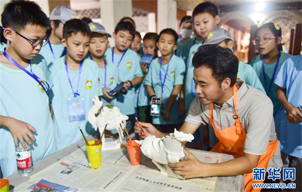 7月16日,河南省洛陽市孟津區(qū)朝陽鎮(zhèn)南石山村唐三彩文化園生產(chǎn)車間,民間藝人張毅鵬向小學(xué)生們講解唐三彩制作技藝。