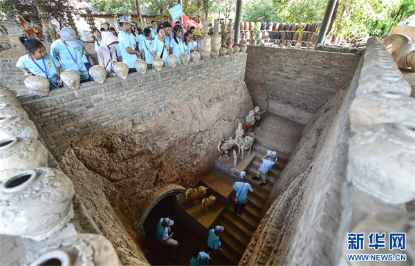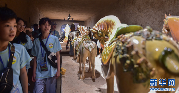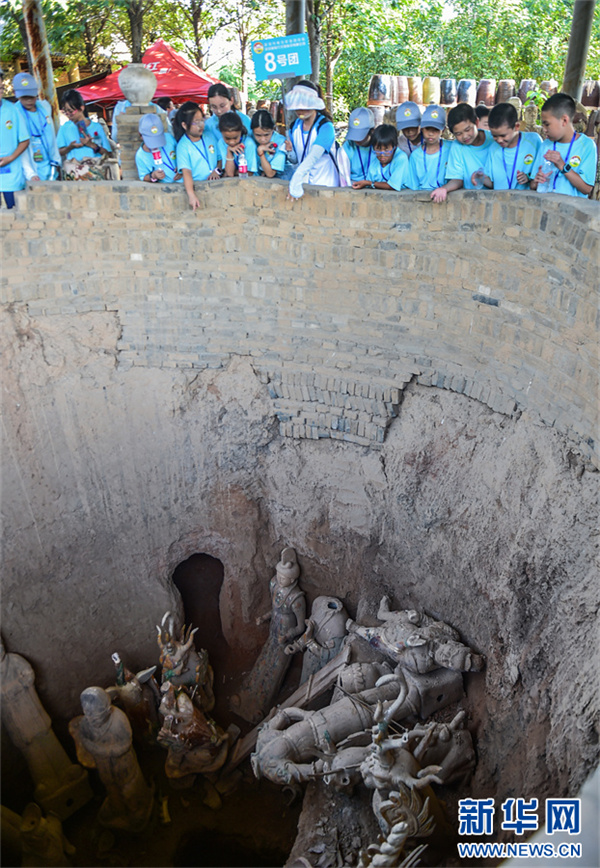 7月16日,河南省洛陽市孟津區(qū)朝陽鎮(zhèn)南石山村唐三彩文化園,小學(xué)生們在參觀復(fù)原的古代唐三彩窯爐遺址。