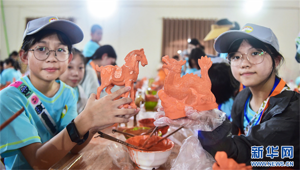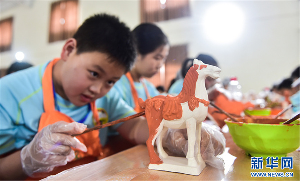 7月16日,河南洛陽市孟津區(qū)朝陽鎮(zhèn)南石山村唐三彩文化園,小學(xué)生在展示自己制作的唐三彩素胎施釉作品。