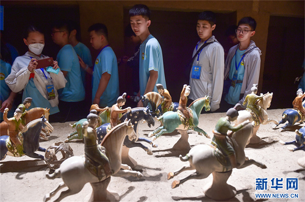 7月16日,河南洛陽市孟津區(qū)朝陽鎮(zhèn)南石山村唐三彩文化園,小學(xué)生們在欣賞仿古唐三彩作品。