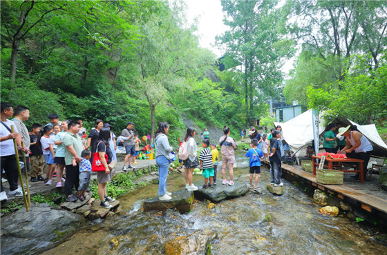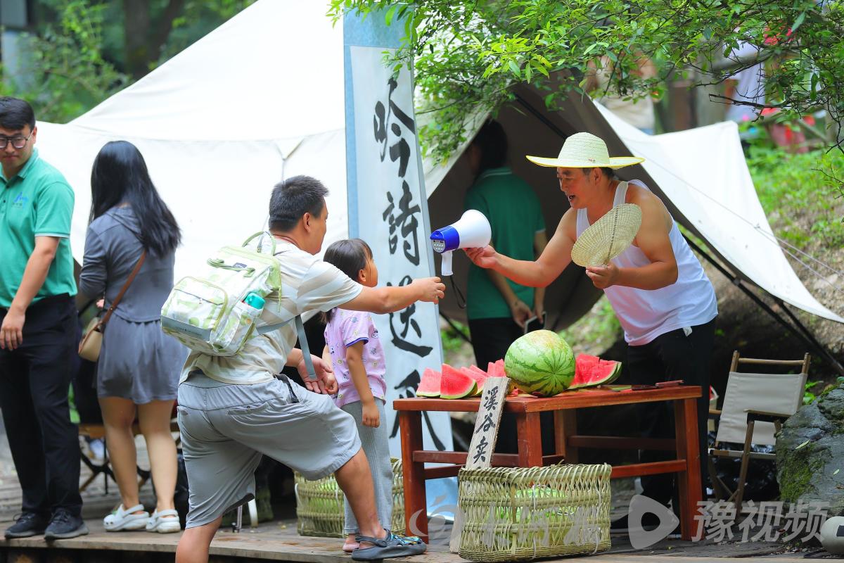 近日氣溫連連攀升,素有“北國水鄉(xiāng)”之稱的重渡溝景區(qū)成了游客避暑納涼的首選地。7月19日,在重渡溝景區(qū)金雞河畔“吟詩送瓜”攤位前,游客紛紛駐足參與。