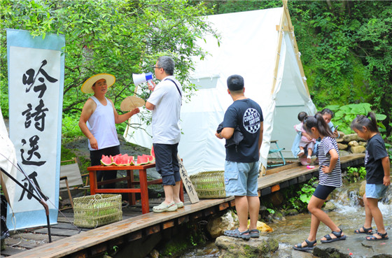 這位溪谷賣瓜郎名為歲古欒,是重渡溝的一名村民,“我本身對詩詞就比較熱愛,想通過這種方式,讓更多的人感受傳統(tǒng)文化的魅力,同時也讓來到重渡溝的游客能獲得一份夏日清涼。”
