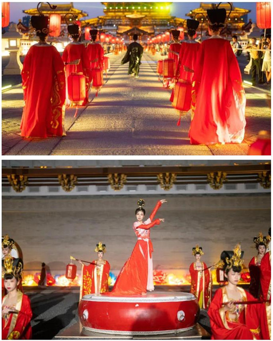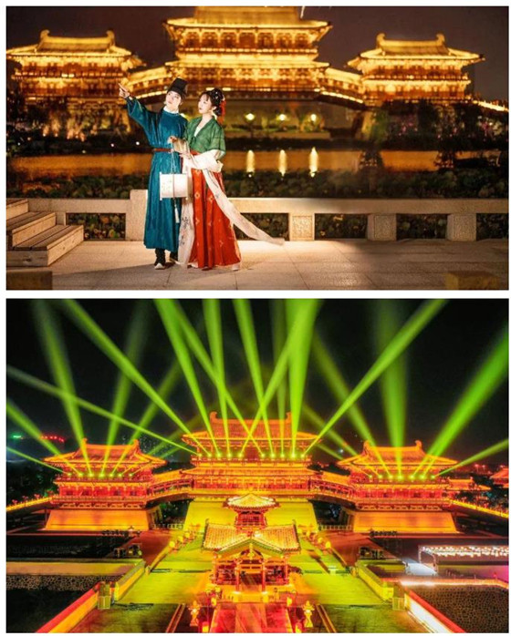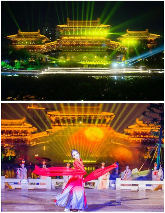 瑤池宮苑,熠彩流光,華燈初上,水幕舞臺前,瑤光殿光影璀璨,一幕幕精彩的實景演出與光影裂變完美融合,帶您漸入盛唐意境,一睹盛唐風采。