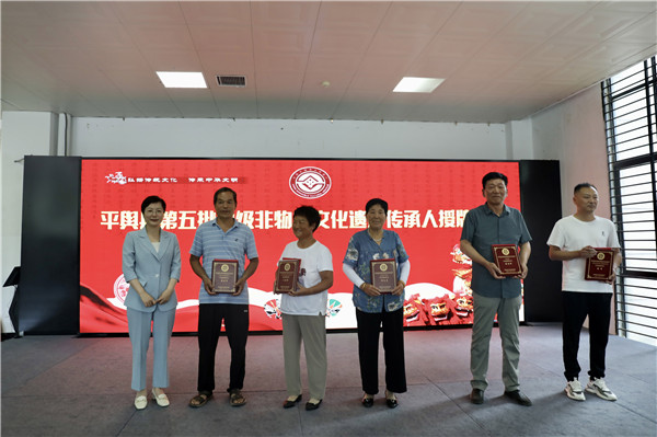 儀式上,平輿縣文廣旅局負(fù)責(zé)人介紹平輿縣新增省市縣級(jí)非物質(zhì)文化遺產(chǎn)項(xiàng)目及代表性傳承人基本情況;與會(huì)領(lǐng)導(dǎo)分別向平輿縣絲弦道省級(jí)傳承人、太平車制作技藝傳承人、張氏燒雞技藝傳承人、仙翁廟與懸壺濟(jì)世傳說傳承人、楊埠打花棍傳承人5位傳承人授牌。