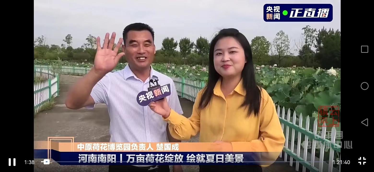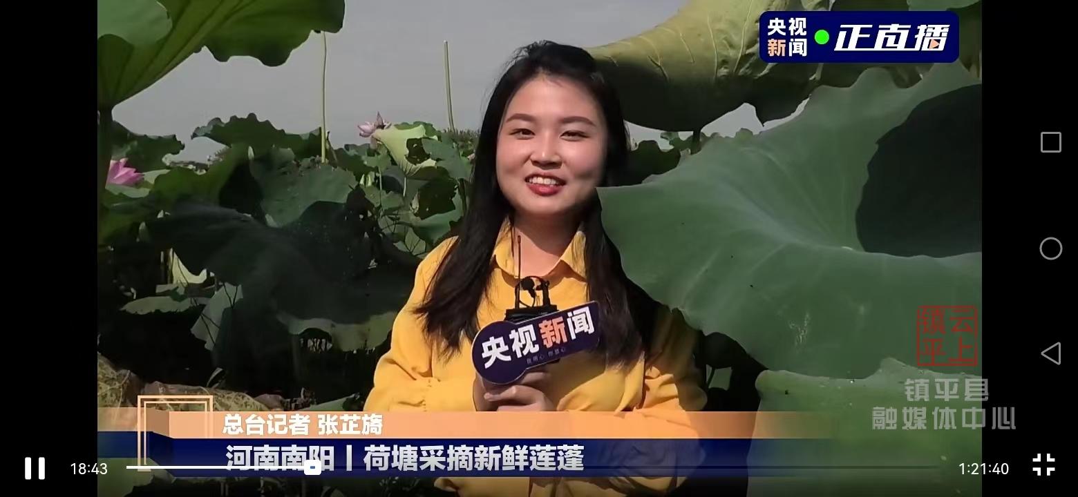 央視總臺(tái)記者張芷旖:“央視新聞的網(wǎng)友們大家好,我是總臺(tái)記者張芷旖,今天的荷花直播第一站啊,我們來到了位于河南省南陽(yáng)市鎮(zhèn)平縣的中原荷花博覽園.....”