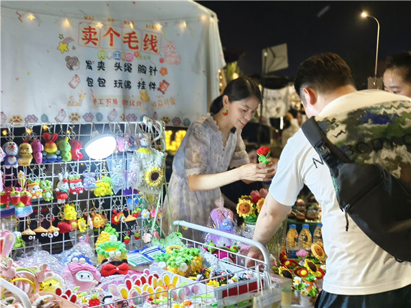 在市集活動現(xiàn)場,46輛私家車整齊排列,打開后備廂、掛上彩燈、擺好桌椅,拉起創(chuàng)意十足的橫幅,擺出各種事先準備好的商品。美食茶飲、特色產品、潮玩手作、非遺文創(chuàng),還有二胡演奏、吉他彈唱、漢服展示等,加上“賣個毛線”“日飲夜飲,前途似錦”“不為賺錢,只為等你經過”等一個個風格各異的攤位標語,為夏日的夜色增添了濃濃的煙火氣和酷酷的文藝范兒。