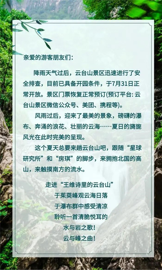 7月30日,云臺山景區(qū)發(fā)布通知,經(jīng)過景區(qū)安全排查,目前已具備開園條件,于7月31日正常開放。