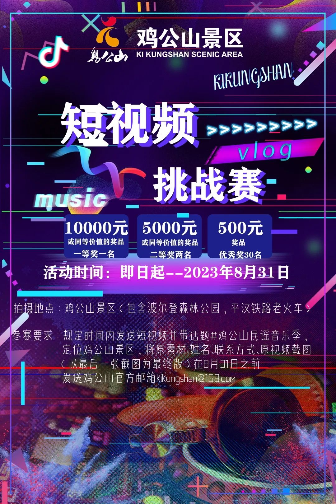 3、參賽要求:規(guī)定時間內(nèi)發(fā)送短視頻并帶話題#雞公山民謠音樂季,定位雞公山景區(qū),將原素材、姓名、聯(lián)系方式、原視頻截圖(以最后一張截圖為最終版)在8月31日之前發(fā)送雞公山官方郵箱kikungshan@163.com,滿足此要求則視為參賽成功。(單條作品只能參與一項(xiàng)獎項(xiàng)評選,且相同作品內(nèi)容不同平臺發(fā)布僅接受一次評選)。