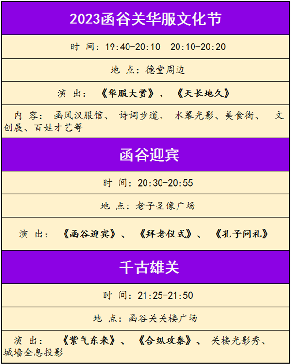 內(nèi)容:《紫氣東來》、《合縱攻秦》還有關(guān)樓投影秀和光影秀。在這里,讓我們穿越到2000多年前,看關(guān)令尹喜如何強留老子著書,看三晉聯(lián)軍如何進攻函谷關(guān)。