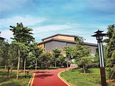 記者發(fā)現(xiàn),和許多游園里的樂道不同,這里的樂道蜿蜒曲折,很有藝術(shù)性,帶您來到不同的區(qū)域。樂道旁,有仿古造型的路燈,還有長椅,方便游客休息。由于地勢起伏,東邊略高,有小徑通往較深的林子里。向四周眺望,南邊的樓房和西邊黃河流域非遺保護(hù)展示中心獨特的建筑若隱若現(xiàn)。